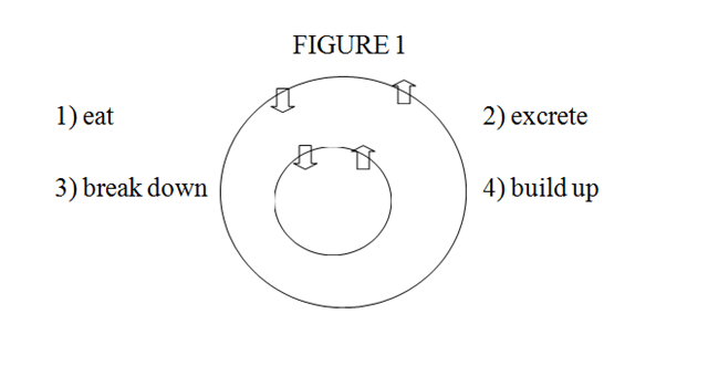 Consider only somatic functions as illustrated in the abstract in Figure 1. If consumption is understood as eating and excreting more (outer arrows 1 and 2) while digestion is understood as breaking down (degradative metabolism) and building up (biosynthetic metabolism) more (inner arrows 3 and 4), then sizes should be as stated – small versus large, but the former deplete and degrade the external environment while the latter deplete and degrade the internal environment. On the other hand, if consumption is understood as eating and breaking down more (left arrows 1 and 3) while digestion is understood as building up and excreting more (right arrows 4 and 2), then depletion and degradation should be as stated with the former depleting (the external and internal environments) and digestion degrading (the internal and external environments) but both sizes should be intermediate (although cost differences could shove both smaller or larger for example). An analogous break down can be applied to offspring production and re-production.